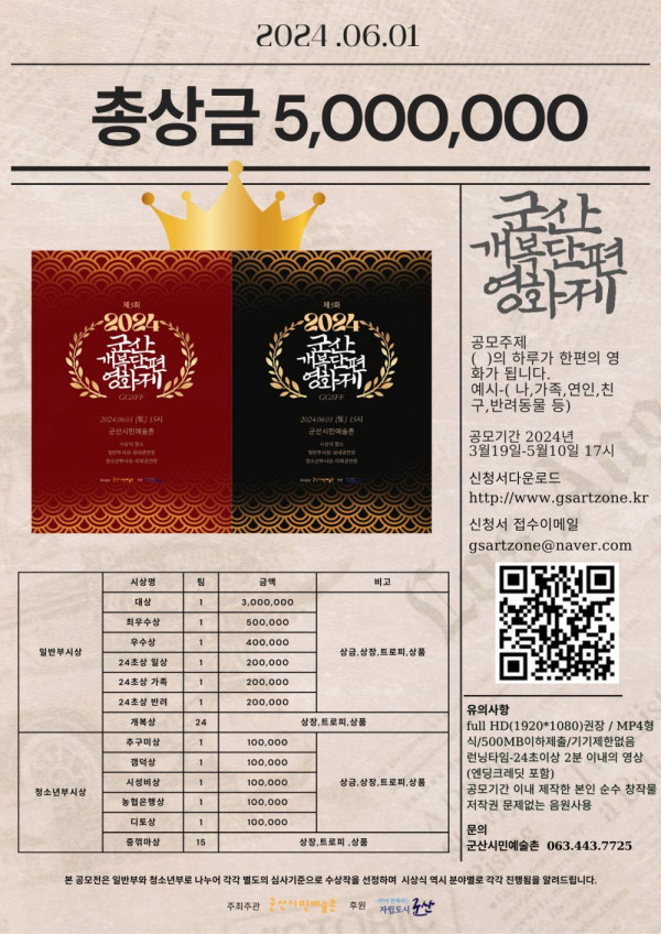 ■ 공모내용 ( )의 하루가 한편의 영화가 됩니다 (예시) - 나 ,가족, 연인, 친구, 반려동물 등 ■ 참가자격 대한민국 국민 누구나 ■ 참가방법 군산시민예술촌 홈페이지 ( www.gsartzone.kr ) 공지사항 내 신청서 다운로드 및 작성 후 출품영상과 함께 이메일 ( gsartzone@naver.com )접수 ■ 작품규격 - full HD(1920*1080)권장 - MP4형식 - 500MB이하 - 러닝타임 : 24초 이상~2분 이내 (엔딩크레딧 포함) ■ 시상내역 대상 1점 : 300만원 최우수상 1점 : 50만원 우수상 1점 : 40만원 24초상 일상 1점 : 20만원 24초상 기록 1점 : 20만원 24초상 반려 1점 : 20만원 개복상 24점 : 상장, 트로피, 상품 ■ 유의사항 - 공모기간 내에 제작한 본인 순수 창작물 - 저작권 문제 없는 음원 사용 - 사행산업통합감독위원회 광고 심의규정에 따라 수상작 내용이 수정될 수 있음 - 타 공모전 출품작은 수상 제외될 수 있음 - 본 행사의 취지와 맞지 않는 작품은 수상 제외될 수 있음 |