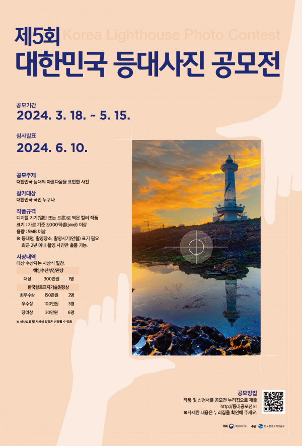 ■ 공모내용 대한민국 등대의 다양한 모습과 가치를 알릴 수 있는 영상 ■ 참가자격 대한민국 국민 누구나[개인 또는 (3인 이하)] ■ 출품수 개인 또는 팀 영상 최대 3작품 이내 : 중복 접수 가능, 수상은 1작품만 가능 ■ 참가방법 공모전 홈페이지를 통한 직접 접수 ■ 작품규격 디지털 기기(일반 또는 드론)로 찍은 컬러 작품 해상도 : 1920 X 1080 이상 길이 : 쇼츠(30초 이내), 단편(3-5분) ※ 등대명, 촬영장소, 촬영시기(연월) 표기 필요 ■ 시상내역 대상 1점 : 300만원 최우수상 2점 : 각 150만원 우수상 3점 : 각 100만원 장려상 3점 : 각 30만원 특별상 10점 : 각 30만원 ■ 결과발표 2024. 6. 10. ■ 유의사항 - 작품의 촬영 장소는 일반인 출입 및 촬영이 가능한 장소여야 하며, 초상권, 저작권, 명예훼손 등 법적 분쟁의 소지가 없어야 함 ※ 드론 촬영 시에는 자격증 소지자가 시행, 촬영 전 허가 증빙자료 필요 - 최종 수상 작품은 원본 파일(RAW 등) 필수 제출 - 제작에 사용된 음악은 저작권에 따른 문제가 없는 음원이어야 함 |