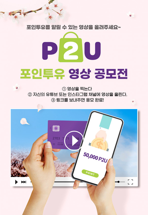 ■ 공모내용 - '포인투유'를 일반인들에게 잘 알릴 수 있는 영상 *'포인투유'란? 포인투유( www.p2u.kr )는 포인트 쇼핑몰입니다. 포인투유 가맹점에서 서비스를 이용하고 카드로 결제하면, 일정 'P2U'코인이 무료로 채굴되어 소비자에게 전송됩니다. 'P2U코인'은 포인투유 쇼핑몰 내에서 사용할 수 있는데, 최대 결제 금액의 30%까지 P2U코인으로 결제할 수 있습니다. ■ 참가자격 대한민국 국민 누구나 ■ 참가방법 1. 본인 인스타그램 혹은 유튜브 채널에 '해시태그(*필수)'를 달고 업로드 한다. - 해시태그 : #포인투유 #P2U 2. 포인투유 홈페이지( www.p2u.kr ) 방문, 회원가입 후, '공모전' 게시판에 업로드 링크를 올린다. ■ 작품규격 - 원본 영상 (avi, mp4, mov 중 택1) : *수상작에 한함 - 개인정보동의서, 저작물사용동의서 : *수상작에 한함 ■ 시상내역 - 대상 (1명) : 300만원 + 200만P2U + 상장 - 금상 (1명) ; 100만원 + 100만P2U + 상장 - 은상 (2명) : 각50만원 + 50만P2U + 상장 - 동상 (3명) : 각 20만원 + 30만P2U + 상장 - 참가상 (10명) : 20만P2U ■ 결과발표 2024.5월중 - 홈페이지 공고