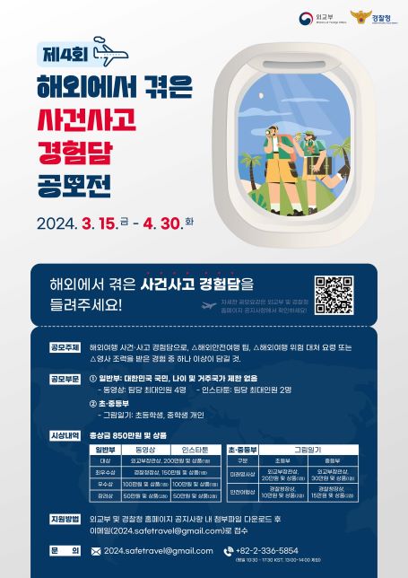 ■ 공모내용 해외여행 사건사고 경험담으로, △해외안전여행 팁, △해외여행 위험 대처 요령 또는 △영사조력을 받은 경험 중 하나 이상이 담길 것. ■ 공모부문 동영상, 인스타툰 ■ 참가자격 대한민국 국민으로, 나이 및 거주국가 제한 없음. 개인 또는 팀 참가. ■ 참가방법 동영상 제작 후 아래의 파일 이메일 제출 - 동영상(MP4) - 참가신청서 및 작품기획서 (excel파일 원본 제출) - 개인정보 이용 동의서, 응모 각서 각 1부 (하나의 pdf파일로 송부) 개인SNS(유튜브 등)에 동영상 업로드 (지정 해시태그 : #해외안전여행 #재외국민보호 #영사조력법 #해외사건사고경험담 #해외위급상황대처 #해외안전상황실 #외교부공모전 #경찰청공모전 #공모전) ■ 작품규격 상황극, 브이로그, 댄스, 로고송, 챌린지 영상 등 형식 제한 없음 - 엔딩크레딧에 음원 등 출처 명시 必 - 크기(1920×1080), 파일(mp4) - 길이(4분 이내) - 용량 500MB 이내 ■ 시상내역 대상 : 외교부장관상 1점 및 상금 200만 원 및 상품 최우수상 : 경찰청장상 1점 및 상금 150만 원 및 상품 우수상 1점 : 상금 100만 원 및 상품 장려상 2점 : 상금 50만 원 및 상품 ※ 대상 및 최우수상은 인스타툰과 통합시상입니다 ■ 결과발표 6월 중순 예정 |