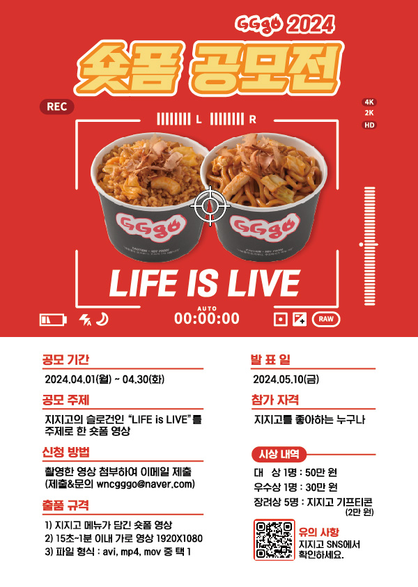 ■ 공모내용 지지고의 슬로건인 “LIFE is LIVE”를 주제로 한 숏폼 영상 ■ 참가자격 지지고를 좋아하는 누구나 ■ 참가방법 제출 및 문의 사항 wncgggo@naver.com * 제출 시 메일 제목 명: [지지고 영상 공모전] 응모자 성함 작품 제목 본문에는 응모자 성함 및 연락처/작품 제목/주제/콘셉트 기재 * 문의 시 메일 제목 명: [지지고 공모전 문의사항] 문의 제목 기재 요망 ■ 작품규격 1) 지지고 메뉴가 담긴 숏폼 영상 2) 15초~1분 이내 가로 영상 1920X1080 3) 파일 형식 : avi, mp4, mov 중 택 1 ■ 시상내역 - 대 상 1명 : 50만 원 - 우수상 1명 : 30만 원 - 장려상 5명 : 지지고 기프티콘 (2만 원) ■ 결과발표 2024.05.10(금) |