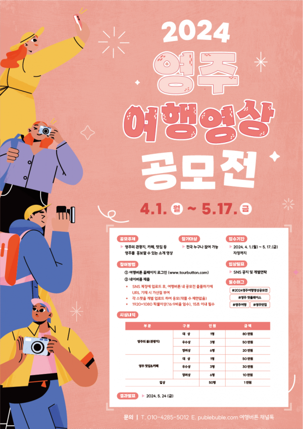 ■ 공모내용 영주의 관광지, 카페, 맛집 등 영주를 홍보 할 수 있는 소개영상 ■ 공모부문 영주의 봄(관광지), 영주 맛집 & 카페 ■ 참가자격 전국 누구나 참여가능 ■ 출품수 중복지원 가능 ■ 참가방법 ① 여행버튼 홈페이지 로그인 ( www. tourbutton.com ) ② 공모전 페이지 접속 & 신청 네이버 폼 작성 ③ 온라인 제출 (중복지원 가능) ※ 필수태그 : #2024영주여행영상공모전 #영주 핫플레이스 #영주여행 #영주맛집 ■ 작품규격 - 1920×1080 픽셀 이상 - 16:9 비율 엄수 - 파일형태는 mp4 형식 - 15초 이내 필수 ※ 출품자가 직접 촬영 및 제작한 것을 원칙으로 함 ※ 동영상 편집 시 저작권에 위배되지 않는 오픈소스(이미지, 영상, 음원 등) 사용 필수 ■ 시상내역 영주의 봄(관광지) 대상 1점 : 80만원 우수상 3점 : 각 50만원 장려상 6점 : 각 20만원 영주 맛집 & 카페 대상 1점 : 50만원 우수상 3점 : 각 30만원 장려상 6점 : 각 10만원