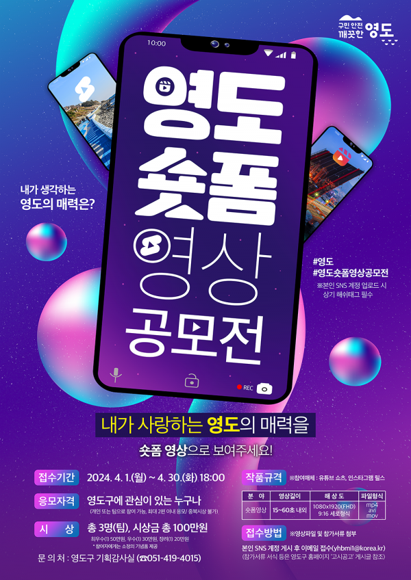 ■ 공모내용 내가 사랑하는 영도의 매력을 보여주세요! - 내가 사랑하는 영도의 쉼·맛·멋 등 영도구의 매력을 알리는 창의적인 콘텐츠 ■ 참가자격 영도를 좋아하는 누구나 ■ 출품수 최대 2편 이내 응모/ 중복시상 불가 ■ 참가방법 제출방법 : 본인 SNS 계정 게시 후 이메일 접수( yhbmi1@korea.kr ) - 이메일 제출 시 : 영도구 숏폼 공모전_(성명)으로 제출 - 접수 및 심사기간 중 SNS 계정 전체공개 설정 및 필수 해시태그 기재 ※ 필수 해시태그 : #영도구, #영도숏폼영상공모전 제출서류 : 동영상 파일, 참가신청서, 서약서 ■ 작품규격 분야 : 숏폼영상 길이 : 15~60초 내외 해상도 : 1080*1920(FHD) 이상 9:16 세로형식 파일형식 : MP4, avi, mov ■ 시상내역 최우수 1점 : 50만원 우수 1점 : 30만원 장려 1점 : 20만원 ■ 결과발표 홈페이지 게시 및 수상자에 한해 개별 통보(5월 중) ■ 유의사항 - 공모 응모는 실명으로 하는 것을 원칙으로 함. - 제출된 영상·관련 서류는 선정여부를 불문하고 반환하지 않음. - 응모작품의 저작권, 초상권 등은 법적인 문제가 전혀 없는 것이어야 하며, 응모작에 대한 모든 책임은 응모자에게 있음. - 공고내용의 해석에 대한 사항은 영도구의 판단에 따르며, 사정에 따라 진행 일정 및 내용 등은 변경될 수 있음. - 시상작에 대한 소유권, 저작권, 지적재산권 등 일체의 권리는 영도구에 귀속되며, 필요에 따라 수정 또는 변형하여 사용 가능하며, 향후 홍보자료 등으로 활용될 수 있음. - 동일인이 여러 건 채택될 경우 상위 1건만 시상함. - 심사결과에 따라 수상 등급별 인원·금액은 조정될 수 있으며, 수상 대상자가 없을 수 있음. - 심사내용은 공개되지 않으며, 심사결과에 대한 어떤 이의도 제기할 수 없음. |