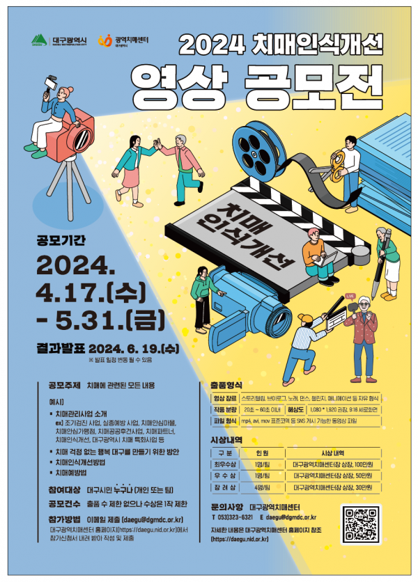 ■ 공모내용 치매와 관련된 모든 내용 (자유주제) <예시> 1. 치매관리사업 소개 (조기검진 사업, 실종예방사업, 치매안심마을, 치매안심가맹점, 치매공공후견사업, 치매파트너, 치매인식개선, 치매환자 쉼터, 치매예방·인지프로그램, 기억공원, 대구광역시 치매 특화사업 등) ※ 정보참고: 대구광역치매센터 홈페이지, 대구아름도시대구, SNS 검색 2. 치매인식개선 방법 3. 치매 걱정 없는 행복 대구를 만들기 위한 방안 4. 치매 예방법 ■ 참가자격 대구시민 누구나(개인 또는 팀) ■ 출품수 출품 수 제한 없으나 단, 수상은 1작 제한 ■ 참가방법 - 이메일 접수 : daegu@dgmdc.or.kr - 제출서류 : ➀ 참가 신청서 ➁ 개인정보 수집·이용 동의서 ③ 원본 영상 ※ 서류 및 영상을 하나의 폴더에 넣어 ZIP파일로 압축 제출 - 제출 파일명 : 영상공모전 이름(제목) ex.영상공모전 홍길동(대구 치매안심가맹점 투어) ■ 작품규격 - 영상 장르 : 스토리텔링, 브이로그, 노래, 댄스, 챌린지, 애니메이션 등 자유 형식 - 작품 분량 : 20초~60초 이내 - 해상도 및 화면 비율 : 1,080*1,920 권장, 9:16 세로화면 - 파일 형식 : mp4, avi, mov 표준코덱 등 SNS 게시 가능한 동영상 파일 ■ 시상내역 최우수상 1점 : 대구광역치매센터장 상장, 100만원 우수상 1점 : 대구광역치매센터장 상장, 50만원 장려상 4점 : 대구광역치매센터장 상장, 각 30만원 ■ 결과발표 홈페이지 및 SNS 발표 및 개별 시상 |