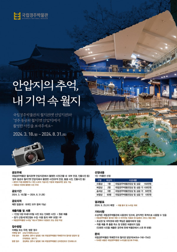 ■ 공모내용 - 국립경주박물관 월지관(옛 안압지관)의 내‧외부를 배경으로 촬영한 사진(건물 내‧외부 전경, 인물사진 포함) - ‘경주 동궁과 월지’(옛 안압지)를 배경으로 촬영한 사진(유적 전경, 발굴 사진, 인물사진 포함) ■ 참가자격 제한 없음(내‧외국민 모두 참여 가능) ■ 출품수 1인당 5점 이내 ■ 참가방법 이메일 또는 우편, 방문 접수 - 이메일 접수: silla1318@korea.kr - 우편 접수: 경상북도 경주시 일정로 186 국립경주박물관 학예연구과 사진 공모전 담당자 앞(우편번호: 38171) * 우편 접수는 마감일(8월 31일) 도착분까지 접수 - 방문 접수: 국립경주박물관 신라천년보고 안내데스크 ㅇ (제출서류) 참가신청서(개인정보 수집·이용 동의 여부 포함) 1부 ■ 작품규격 * 본인이 직접 촬영했거나 개인 소유의 기념사진 가운데 미발표작만 공모 가능 * 1985년 이전에 촬영한 사진 우대 ■ 시상내역 으뜸상 1명 : 국립경주박물관장상 및 상금 150만원 버금상 2명 : 국립경주박물관장상 및 상금 각 100만원 솜씨상 5명 : 국립경주박물관장상 및 상금 각 50만원 보람상 60명 : 국립경주박물관장상 및 상금 각 10만원 ■ 결과발표 2024. 9. 25.(수) 예정 * 개별 통지 및 누리집 게재 |