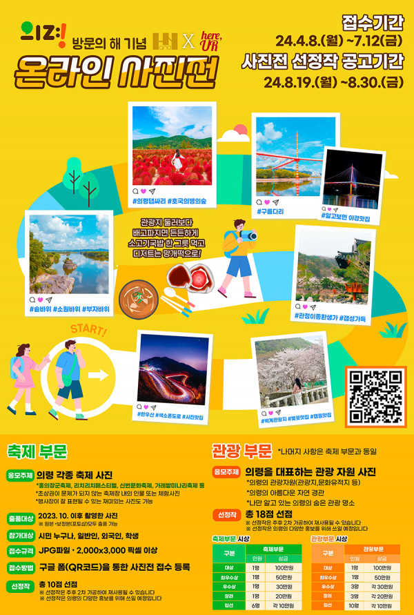 ■ 공모내용 축제부문 의령 각종 축제 사진 - 총의장군축제, 리치리치페스티벌, 신변문화축제, 가래발미나리축제 등 - 초상권이 문제가 되지 않는 축제장 내의 인물 또는 체험사진 - 행사장이 잘 표현될 수 있는 재미있는 사진도 가능 관광부문 의령을 대표하는 관광 자원 사진 *의령의 관광자원(관광지, 문화유적지 등) *의령의 아름다운 자연 경관 *나만 알고 있는 의령의 숨은 관광 명소 ■ 공모부문 축제부문, 관광부문 ■ 참가자격 시민 누구나, 일반인, 외국인, 학생 ■ 출품수 부문별 개인당 총 5점까지 출품가능 ■ 참가방법 구글폼을 통한 접수 ■ 작품규격 JPG파일 2,000×3,000 픽셀 이상 ※ 2023.10. 이후 촬영한 사진 ■ 시상내역 축제부문 대상 1점 : 100만원 최우수상 1점 : 50만원 우수상 1점 : 30만원 장려상 1점 : 20만원 입선 6점 : 각 10만원 관광부문 대상 1점 : 100만원 최우수상 1점 : 50만원 우수상 3점 : 30만원 장려상 3점 : 20만원 입선 10점 : 각 10만원 |