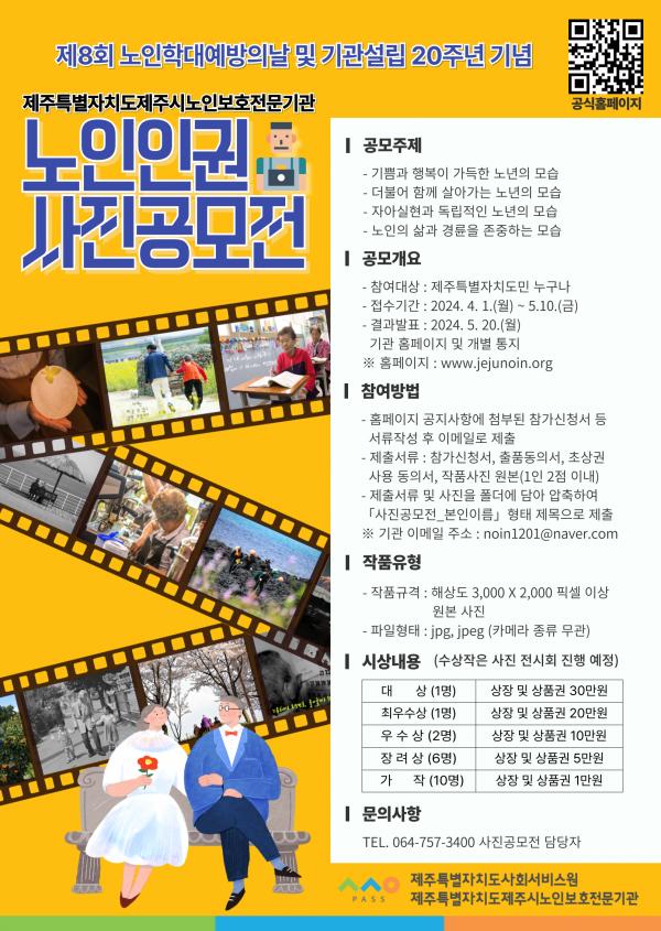 ■ 공모내용 (1) 기쁨과 행복이 가득한 노년의 모습 (2) 더불어 함께 살아가는 노년의 모습 (3) 자아실현과 독립적인 노년의 모습 (4) 노인의 삶과 경륜을 존중하는 의미를 담은 사진 ■ 참가자격 제주특별자치도 도민 누구나 (참가비 없음) ■ 출품수 1인 2점이내 ■ 참가방법 (1) 접수기간: 2024. 4. 1.(월) ~ 5. 10.(금) 18:00 (2) 제출서류: 참가신청서, 출품 동의서, 초상권 사용 동의서(얼굴이 노출되는 사진, 인물 식별이 가능한 사진의 경우), 작품사진 원본 (서류 양식은 본 기관 홈페이지 사진공모전 공지사항에 첨부되어 있음) (3) 제출방법: 제출서류 및 사진을 폴더에 담아 압축하여 『사진공모전_본인이름』 형태의 폴더 제목을 붙여 이메일로 제출 ( 이메일 주소: noin1201@naver.com ) ■ 작품규격 (1) 국내·외에 발표되지 않고 전시되지 않은 작품 (2) 사진규격: 해상도 3,000 × 2,000 픽셀 이상 원본 사진 (3) 파일형태: jpg, jpeg (1인 2점이내, 사진제목 붙이기) ■ 시상내역 (1) 대상 1명: 상장 및 상품권 30만원 (2) 최우수상 1명: 상장 및 상품권 20만원 (3) 우수상 2명: 상장 및 상품권 10만원 (4) 장려상 6명: 상장 및 상품권 5만원 (5) 가작 10명: 상장 및 상품권 1만원 ■ 결과발표 5. 20.(월) |