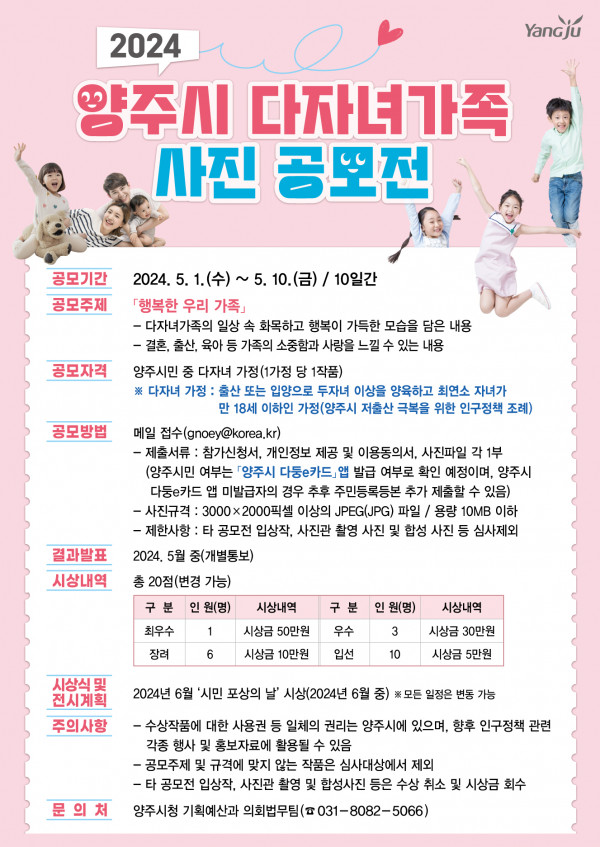 ■ 공모내용 「행복한 우리 가족」 - 다자녀가족의 일상 속 화목하고 행복이 가득한 모습을 담은 내용 - 결혼, 출산, 육아 등 가족의 소중함과 사랑을 느낄 수 있는 내용 ■ 참가자격 양주시민 중 다자녀 가정 ※ 다자녀 가정 : 출산 또는 입양으로 두자녀 이상을 양육하고 최연소 자녀가 만 18세 이하인 가정 (양주시 저출산 극복을 위한 인구정책 조례) ■ 출품수 1가정 당 1작품 ■ 참가방법 메일 접수( gnoey@korea.kr ) - 제출서류 : 참가신청서, 개인정보 제공 및 이용동의서 및 사진파일 각 1부 (양주 시민 여부는 “양주시 다둥e카드”앱 발급 여부로 확인 예정이며, 양주시 다둥e카드 앱 미발급자의 경우 추후 주민등록등본 추가 제출할 수 있음) ■ 작품규격 3000×2000픽셀 이상의 JPEG(JPG) 파일 / 용량 10MB 이하 ■ 시상내역 최우수 1점 : 50만원 우수 3점 : 각 30만원 장려 6점 : 각 10만원 입선 10점 : 각 5만원 ■ 결과발표 2024. 5월 중(개별통보) ■ 유의사항 - 수상작품에 대한 사용권 등 일체의 권리는 양주시에 있으며, 향후 인구정책 관련 각종 행사 및 홍보자료에 활용될 수 있음 - 공모주제 및 규격에 맞지 않는 작품은 심사대상에서 제외 - 타 공모전 입상작, 사진관 촬영 및 합성사진 등은 수상 취소 및 시상금 회수 |