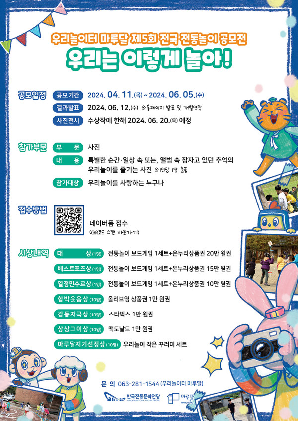 ■ 공모내용 추억의 우리놀이를 즐기는 사진 (특별한 순간·일상 속 또는, 앨범 속 잠자고 있던 추억의 우리놀이를 즐기는 사진) ■ 참가자격 우리놀이를 사랑하는 누구 ■ 출품수 1인당 1장 출품 ■ 참가방법 네이버폼을 통한 접수 https://form.naver.com/response/_I5p_kpeiz9n1oW7ckNr6w ■ 시상내역 - 대상(1명) 전통놀이 보드게임 1세트+온누리상품권 20만 원권 - 베스트포즈상(1명) 전통놀이 보드게임 1세트+온누리상품권 15만 원권 - 열정만수르상(1명) 전통놀이 보드게임 1세트+온누리상품권 10만 원권 - 함박웃음상(10명) 올리브영상품권 1만 원권 - 감동자극상(10명) 스타벅스 1만 원권 - 상상그이상(10명) 맥도날드 1만 원권 - 마루달 지기 선정상(10명) 우리놀이 작은 꾸러미 세트 ■ 결과발표 2024. 6. 12.(수) *홈페이지 발표 및 수상자 개별연락 |