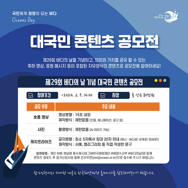 ■ 공모내용 제29회 바다의 날을 기념하고, 의미와 가치를 공유 할 수있는 축하 영상, 응원 메시지 등이 포함된 자유양식의 콘텐츠 ■ 참가자격 대한민국 국민 누구나 ■ 참가방법 - 접수기간 내 개인 SNS 채널에 필수해시태그*와 함께 콘텐츠를 업로드 후 전자우편 접수 * 해시태그: #한국해양재단 #해양수산부 #바다의날 - 제출서류 : 작품 원본, 참가신청서, 서약서, 개인정보 수집 및 이용 동의서 - 제출방법 : join@ocean.or.kr / 전자우편 접수 * 이메일 제목 : 제29회 바다의 날 기념 대국민 콘텐츠 공모-응모분야 ■ 작품규격 제한없음(AI 이미지 가능) ■ 시상내역 금상 1점 : 30만원 은상 1점 : 20만원 동상 3점 : 각 10만원 ※ 사진, 영상, 캐치프라이즈 통합시상입니다 |
