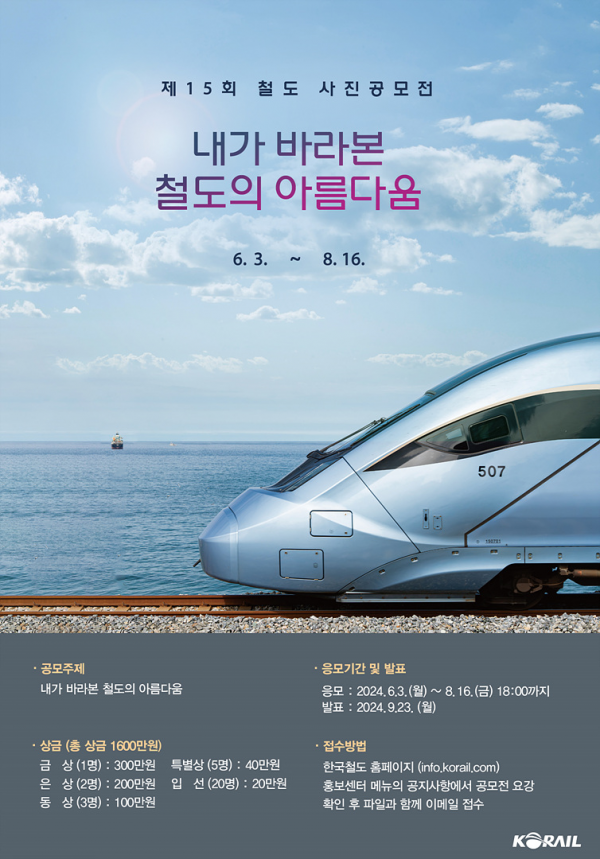 ■ 공모내용 내가 바라본 철도의 아름다움 - 다른 작품들과 차별화될 수 있는 창의적인 작품 - 철도의 모습을독창적인 감각으로 나타낸 작품 - 철도와 함께한아름다웠던 순간과 추억을 담은 작품 - 사람과 자연 그리고철도가 조화된 작품 ■ 참가자격 철도와 사진을 좋아하는 누구나 ■ 출품수 1인3점 이내, 미발표작 ■ 참가방법 이메일 접수( Email : korailphoto@naver.com ) - 제출서류 : 출품신청서,개인정보 제공동의서 ■ 작품규격 -파일용량은3MB이상,해상도는 장축: 3000Pixel ·단축: 2000Pixel이상의 촬영정보(EXIF)가 포함된JPG(JEPG) ■ 시상내역 금상 1점 : 300만원 은상 2점 : 각 200만원 동상 3점 : 각 100만원 특별상 5점 : 40만원 입선 20점 : 각 20만원 ■ 결과발표 2024년9월23일(월)한국철도공사 홈페이지(info.korail.com→홍보센터→공지사항) |