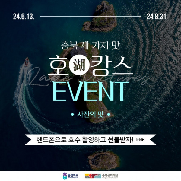 ■ 공모내용 2024년 충북 여름 호수를 예쁘게 담아줄 작가를 모집합니다. 충북의 아름다움이 담긴 호수를 알려주세요. ■ 출품수 1인 2컷 제한 ■ 참가방법 사진을 이메일로 전송후 네이버폼을 통한 접수 이메일 : art4477@cbfc.or.kr 네이버폼 : https://form.naver.com/response/aEGBtYu_iTdYhcgMJoMNlw ※ 파일명은 [성함, 제목, 촬영장소]로 기재 필수 ■ 작품규격 - 1000만 화소 이상의 카메라가 장착된 스마트폰 및 카메라 사용 - 사진 해상도: 웹용 72PPI, 인쇄용 300DPI ※ 2024년도에 촬영한 충북호수가 나온 사진 ■ 시상내역 1등 경품: 신세계 상품권 10만 원권 - 1명 2등 경품: BBQ 황금올리브치킨+콜라세트 - 3명 3등 경품: 스타벅스 커피 1잔 - 20명 ■ 결과발표 2024년 9월 9일 |