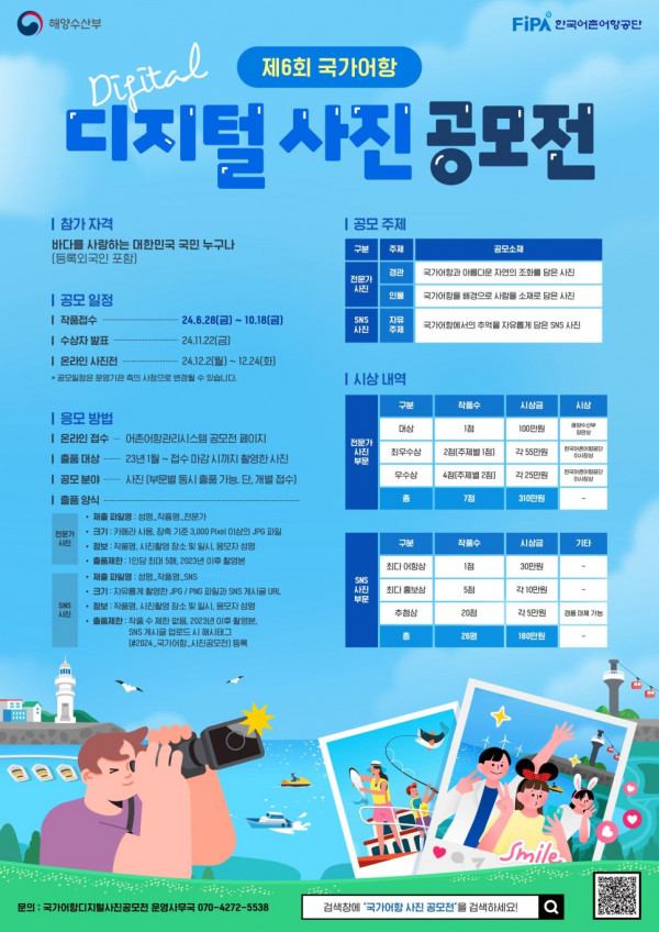 ■ 공모내용 115개 국가어항을 배경으로 경관/인물적 측면을 담은 사진 또는 자유 주제의 SNS 사진 전문가사진 - 경관 : 국가어항과 아름다운 자연의 조화를 담은 사진 - 인물 : 국가어항을 배경으로 사람을 소재로 담은 사진 SNS사진 - 자유쥬제 : 국가어항에서의 추억을 자유롭게 담은 SNS 사진 ※ 국가어항이란? https://naraport.mof.go.kr/info/contest/contestNationalPort.do ■ 공모부문 전문가사진, SNS사진 ■ 참가자격 바다를 사랑하는 대한민국 국민 누구나 (등록외국인 포함) ■ 출품수 전문가 사진 : 1인당 최대 5 작품까지 출품 가능 SNS사진 : 출품 수 제한 없음 ※ 1인당 다작의 출품 및 응모를 허용하나, 수상은 1점에 대해서만 허용함 ■ 참가방법 공모전 홈페이지를 통한 직접 접수 ■ 작품규격 전문가 사진 : 카메라 사용, 장축 기준 3,000 Pixel 이상의 JPG 파일, 2023년 이후 촬영본 SNS사진 : 자유롭게 촬영한 JPG / PNG 파일, 2023년 이후 촬영본, SNS게시글 ■ 시상내역 전문가 사진 대상 1점 : 100만원 최우수상 2점 : 각 55만원 우수상 4점 : 각 25만원 SNS 사진 최다어항상 1점 : 30만원 최다홍보상 5점 : 각 10만원 추첨상 20점 : 각 5만원(경품 대체 가능) ■ 결과발표 2024년 11월 22일(금) 수상자 개별안내 및 공모전 사이트 공지 |
