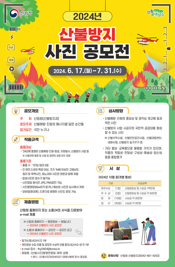 ■ 공모내용 산불예방·진화의 메시지를 담은 순간들 - ’2024년에 촬영한 산불예방·진화·항공, 자원봉사, 산불방지 사업 등 ※ 산불관련 활동 및 사업 등 일련의 과정 모두 포함 ■ 참가자격 국민 누구나 ■ 출품수 1인당 최대 5점 ※ '입선’은 중복 수여 가능하나 ‘장려’ 이상은 상위 한 작품만 수여함 ■ 참가방법 e-mail 접수 : lhy0404@korea.kr - 제출서류 : 참가신청서(서식1) 1부, 개인정보 수집·이용 및 공모전 수상작 이용 동의서(서식2~3) 각 1부 - 파일명 : (산불사진)촬영연월일-제목-성명 * 예시 : (산불사진)20240327-대형산불에 맞서-김산불 ■ 작품규격 - 긴 변이 2,000 픽셀 이상, 크기 1MB 이상인 고해상도 컬러 및 흑백사진, 파노라마 사진은 원본과 함께 제출 - 합성사진은 접수가 불가능 - 사진파일 형식은 JPG, PNG로만 가능 - 사진촬영정보(exif)가 없거나 훼손된 사진은 심사에서 제외 - 모바일(휴대폰), 드론으로 촬영한 사진도 응모 가능 ■ 시상내역 - 최우수상 (1점) : 산림청장상 및 시상금 1백만원 - 우 수 상 (2점) : 산림청장상 및 시상금 각 50만원 - 장 려 (10점) : 시상금 각 20만원 - 입 선 (30점) : 시상금 각 3만원 ■ 결과발표 2024. 10월 중 |