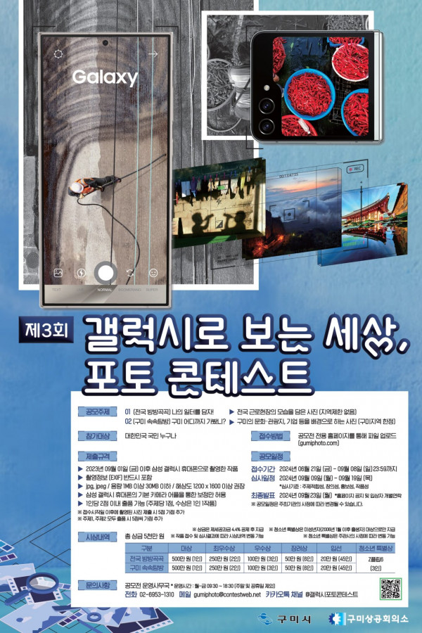 ■ 공모내용 ① (전국 방방곡곡) 나의 일터를 담자! - 전국 근로 현장의 모습을 담은 사진(지역 제한 없음) ② (구미 속속탐방) 구미 어디까지 가 봤니? - 구미의 문화·관광지, 기업 등을 배경으로 하는 사진(구미지역 한정) ■ 공모부문 전국 방방곡곡, 구미 속속탐방 ■ 참가자격 대한민국 국민 누구나 ■ 출품수 1인당 2점 이내(주제당 1점, 수상은 1인 1작품) ■ 참가방법 공모전 홈페이지를 통한 직접 접수 ■ 작품규격 - jpg, jpeg / 용량 1MB 이상 30MB 이하 / 해상도 1200x1600 이상 권장 - 2023년 09월 01일 (금) 이후 삼성 갤럭시 휴대폰으로 촬영한 작품 - 촬영정보(EXIF) 반드시 포함 - 삼성 갤럭시 휴대폰의 기본 카메라 어플을 통한 보정만 허용 ※ 접수시작일 이후에 촬영된 사진 제출 시 5점 가점 추가 ※ 주제1, 주제 2 모두 출품 시 5점씩 가점 추가 ■ 시상내역 대상 2점(부문별 1점) : 각 500만원 최우수상 4점(부문별 2점) : 각 250만원 우수상 6점(부문별 3점) : 각 100만원 장려상 12점(부문별 6점) : 각 50만원 입선 90점(부문별 45점) : 각 20만원 ■ 결과발표 2024년 09월 23일 (금) *홈페이지 공지 및 입상자 개별연락 ■ 유의사항 - 출품한 작품은 반출이 불가하며, 수상작의 저작권은 제작자에게 있음 - 초상권, 저작권, 상표권 등의 법적분쟁 발생 시 출품자의 책임 - 타 공모전 수상작, 타인 및 법인 등에 저작권이 매도되었거나 진행 중인 작품은 출품을 제한하며 차후 - 적발 시 입상자격을 철회 - 수상작품은 공고된 상금이나 부상을 지급함으로써 정당한 대가를 지급하는 것으로 간주하며, 주최기관은 - 수상작에 대한 저작재산권, 복제권, 전시권, 배포권, 2차적 저작물작성권 등을 이용할 권리를 가짐 |