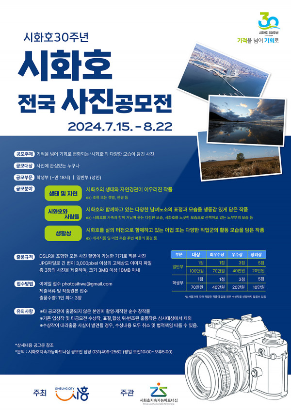 ■ 공모내용 시화호를 소재로 한 미발표 자유작 - 기적을 넘어 기회로 변화되어가는 시화호의 다양한 모습을 담은 자유주제 - 생태 및 자연 : 시화호의 생태와 자연경관이 어우러진 작품 ex) 조류 또는 갯벌, 전경 등 - 시화호와 사람들 : 시화호와 함께하고 있는 다양한 남녀노소의 표정과 모습을 생동감 있게 담은 작품 ex) 시화호를 가족과 함께 거닐며 웃는 다정한 모습, 시화호를 느긋한 모습으로 산책하고 있는 노부부의 모습 등 생활상 - 시화호를 삶의 터전으로 함께하고 있는 어업 또는 다양한 직업군의 활동 모습을 담은 작품 ex) 레저직종 및 어업 혹은 주변 마을의 풍경 등 ■ 공모부문 학생부, 일반부 ■ 참가자격 학생부 : ~ 만18세 청소년 일반부 : 성인 ■ 출품수 1인 최대 3장 ■ 참가방법 이메일 접수 : photosihwa@gmail.com - 이메일 제목: 2024시화호 사진공모전_본인 이름 - 첨부파일명: ① 참가신청서: 본인이름_참가신청서, ② 초상권 사용 동의서: 본인이름_동의서, ③ 출품작: 본인이름_작품명 ■ 작품규격 - DSLR을 포함한 모든 사진 촬영이 가능한 기기로 찍은 사진 - JPG파일로 긴 변이 3,000pixel 이상의 고해상도 이미지 파일 - 총 3장의 사진을 제출하며, 크기 3MB 이상 10MB 이내 - 흑백사진, 세로형 사진 불가(올컬러 가로형 사진만 가능) - 응모자가 직접 촬영한 시화호 소재의 사진 - 색감 보정 수준의 리터치는 가능, 과도한 변형(포토샵 등) 불가 - 작품 응모 시 원본 파일과 함께 제출 * 원본 정보(EXIF)가 없는 작품은 인정하지 않음. 촬영일 필수 ■ 시상내역 일반부 대상 1점 : 100만원 최우수상 1점 : 70만원 우수상 3점 : 각 40만원 장려상 5점 : 각 20만원 학생부 대상 1점 : 70만원 최우수상 1점 : 40만원 우수상 3점 : 각 20만원 장려상 5점 : 각 10만원 ■ 결과발표 2024. 09. 10(화) / 개별 통보 및 홈페이지 게재 ■ 유의사항 ○ 동일인의 다수 작품이 수상범위에 들면 최고 등수를 우선순위로 선정함 ○ 심사는 비공개로 진행되며 심사위원 구성, 심사기준, 심사결과에 대해 이의를 제기할 수 없음 ○ 심사결과에 따라 시상내용은 조정될 수 있으며, 적합한 작품이 없을 경우 수상작을 선정하지 않을 수 있음 ○ 수상작은 시화호 홍보를 위해 SNS게시, 사진집 제작 등에 사용되거나 2차 저작물로 재가공 해 활용할 수 있음 ○ 수상작에 한 해 공모전 취지에 따라 원본에 수정을 요구할 수 있음 ○ 상금에 대한 제세공과금은 본인 부담이며 세금 공제 후 입금됨 |
