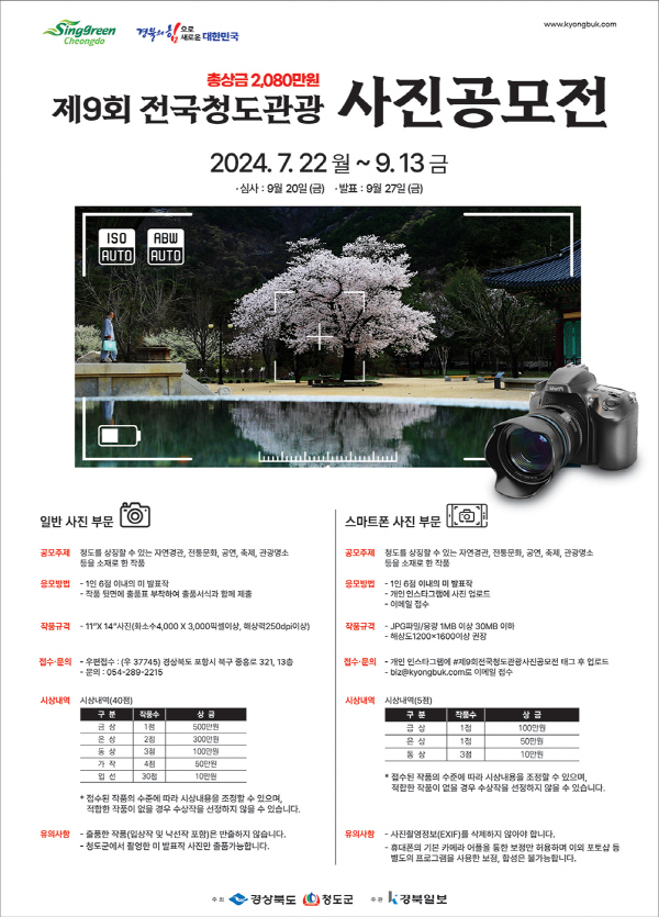 ■ 공모내용 - 청도 관광 9경 : 청도읍성, 새마을운동발상지기념공원, 청도신화랑풍류마을, 운문사, 섶마리한옥마을, 낙대폭포, 유등연지, 와인터널, 청도레일바이크 - 자연 경관 : 사계절 청도의 아름다운 자연경관 - 전통 문화 : 박물관, 문화재 - 공연·축제 : 청도소싸움축제, 청도반시축제, 읍성밟기 등 각종 행사, 축제 - 관광 명소 : 청도남산계곡, 소싸움경기장, 청도프로방스, 한국코미디타운 등 ※ 기타 청도를 상징할 수 있는 특산품, 풍습, 생활상 등을 소재로 한 작품으로 2018년 9월 1일 이후 본인이 직접 촬영한 작품 ■ 공모부문 일반사진 부문, 스마트폰 사진 부문 ■ 참가자격 제한없음 ■ 출품수 1인 6점 이내의 미 발표작 ■ 참가방법 일반사진 부문 : 우편접수 - 출품요령 : 작품 뒷면에 출품표 부착하여 출품서식(경북일보 홈페이지에서 다운로드 후 작성)과 함께 우편으로 제출 - 접수·문의처 : 경북일보(주)로 문의 054-289-2215 (우 37745) 경상북도 포항시 북구 중흥로 321, 13층 스마트폰 사진 부문 1. biz@kyongbuk.com 로 출품 서식 작성하여 파일 첨부 후 이메일 접수 (이메일 제목은 [제9회 전국 청도관광 사진공모전 – 본인이름] 으로 표기) 2. 개인 인스타그램에 #제9회전국청도관광사진공모전 태그 후 사진 업로드 ■ 작품규격 일반사진 부문 11“ X 14” 사진 (화소수 4,000×3,000픽셀이상, 해상력 250dpi이상), ※ 입선이상 작품은 발표 후 7일 이내 원판 필름 제출 스마트폰 사진 부문 - JPG파일/용량 1MB 이상 30MB 이하 - 해상도1200x1600이상권장 - 사진촬영정보(EXIF)를 삭제하지 않아야 함 - 휴대폰의 기본 카메라 어플을 통한 보정만 허용하며 이외 포토샵 등 별도의 프로그램을 사용한 보정, 합성은 불가능