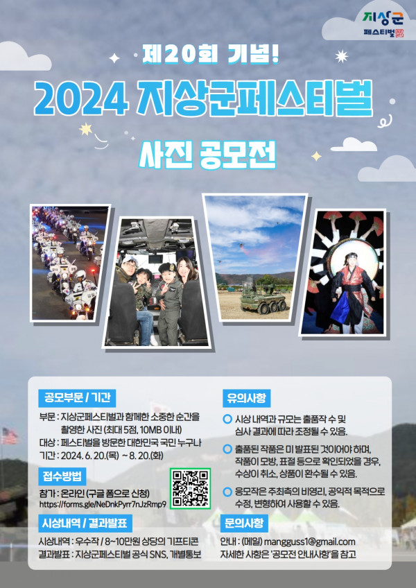 ■ 공모내용 지상군페스티벌과 함께한 소중한 순간을 촬영한 사진 ■ 참가자격 페스티벌을 방문한 대한민국 국민 누구나 ■ 출품수 최대 5점 ■ 참가방법 온라인(구글 폼으로 신청) https://forms.gle/NeDnkPyrr7nJzRmp9 ■ 작품규격 10MB 이내 ■ 시상내역 우수작/8~10만원 상당의 기프티콘 ■ 결과발표 지상군페스티벌 공식 SNS, 개별통보 |