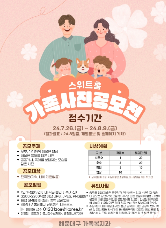 ■ 공모내용 부모가 평소 함께 자녀를 양육하는 행복한 가족의 모습 - 부모가 함께 일하고 함께 돌보는 긍정적 인식을 줄 수 있는 사진 - 성별에 따른 고정된 역할이나 기대 없이 자유롭게 가사·육아를 분담하는 모습 등 ■ 참가자격 공모주제에 관심 있는 누구나(지역, 나이 제한없음) ■ 출품수 1인 1작품에 한함. ■ 참가방법 이메일 제출( 01201zoa@korea.kr ) 제출서류 : 참가신청서, 개인정보 수집·이용·제공 동의서 * 파일명 : 공모자 이름_접수날짜(Ex. 홍길동_0730) ■ 작품규격 흑백·컬러 무관, 3200X2200픽셀 이상 JPG, JPEG, PNG파일 * 파일 크기와 무관하게 출력 및 액자 제작이 가능한 사이즈 ■ 시상내역 최우수 1점 : 30만원 우수 3점 : 각 20만원 장려 5점 : 각 10만원 입상 10점 : 각 4만원 ■ 결과발표 2024. 8. 16.(금) 예정(개별통보 및 홈페이지 게재) ■ 유의사항 가. 수상 작품의 저작재산권(2차 저작물작성권)은 해당 응모자에게 정당한 대가(시상금)가 지급됨에 따라 해운대구청에 귀속되며, 향후 수정 및 보완될 수 있으며 접수자료는 일체 반환되지 않음 나. 작품은 1가족 1작품만 응모가능하며 중복시상 불가함 다. 수상작품 및 우수출품작은 액자로 제작되어 사진전시회에 전시되고 전시 종료후 액자를 응모자에게 증정후 해운대구가 공적인 용도로 활용할 수 있음 라. 응모작은 국내외의 저작권, 특허권 또한 이와 유사한 타인의 권리를 침해하지 않는 순수 창작물이어야 하며 관련 분쟁이 발생할 경우 일체의 법적․도의적 책임은 응모자에게 있음 마. 관련 공모전의 시상 내용 및 제반 일정은 변경될 수 있음 바. 심사점수, 심사내용은 공개하지 않으며 심사위원 구성, 심사기준, 심사결과에 대해 이의를 제기할 수 없음 사. 위에 언급되지 않은 사항은 해운대구청의 결정에 따름 아. 기타 자세한 사항은 해운대구 가족복지과(☎ 051-749-4356)로 문의 바람 |
