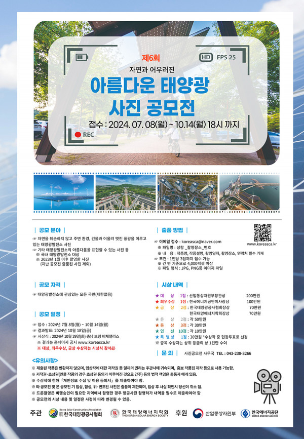 ■ 공모내용 자연을 훼손하지 않고 주변 환경, 건물과 어울려 멋진 풍광을 이루고 있는 태양광발전소 사진 기타 태양광발전소의 아름다움을 표현할 수 있는 사진 등 ※ 국내 태양광발전소 대상 ※ 2023년 1월 이후 촬영한 사진 (지난 공모전 출품된 사진 제외) ■ 참가자격 태양광발전소에 관심있는 모든 국민(제한없음) ■ 출품수 1인당 3점까지 접수 가능 (중복 수상자는 상위 등급의 상 1건만 수여) ■ 참가방법 이메일 접수: koreasca@naver.com ※ 파일명: 성함_촬영장소_번호 ※ 작품명, 작품설명, 촬영일자, 촬영장소, 연락처 필수 기재 ■ 작품규격 - 긴변 기준으로 4,000픽셀 이상 - 파일 형식: JPG, PNG등 이미지 파일 ■ 시상내역 대상 1점 : 200만원 최우수상 1점 : 100만원 금상 2점 : 각 70만원 은상 2점 : 각 50만원 동상 3점 : 각 30만원 입선 10점 : 각 10만원 특별상 1점 : 30만원 ■ 결과발표 2014년 10월 18일(금) |
