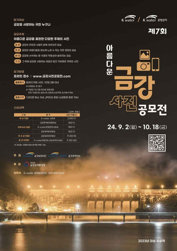 ■ 공모내용 아름다운 금강을 표현한 다양한 주제의 사진 - (공존) 금강의 자연과 사람이 함께 어우러진 모습 - (경관) 금강의 아름다움을 한눈에 느낄 수 있는 자연 경관의 모습 - (생태) 금강에 서식하는 동·식물의 역동성이 보여지는 모습 - (기타) 그 밖에 금강을 사랑하는 마음이 담긴 자유로운 주제의 사진 ■ 참가자격 제한없음 ■ 출품수 1인당 2매 이내 제출 가능 ■ 참가방법 공모전 홈페이지를 통한 직접 접수 ■ 작품규격 1,000만 화소 이상 JP(E)G (스마트폰 촬영 가능) * 타임랩스 등 불가 ■ 시상내역 대상 1점 : 200만원 최우수상 3점 : 각 50만원 우수상 5점 : 각 20만원 입선 30점 : 각 10만원 ■ 유의사항 - 접수된 작품 및 제출물은 일체 반환하지 않으며, 응모 작품(수상작품)에 관한 모든 권리는 응모자에게 있습니다. - 제3자의 초상권 및 저작권 등 기타 제반 권리를 침해하거나, 저작권법상의 다툼의 소지가 있는 작품의 제출로 인해 발생되는 모든 책임은 출품자에게 있습니다. - 필요한 경우 출품자에 추가 자료를 요청할 수 있으며, 개인 정보 수집·이용에 관한 동의서에 비동의 시 공모가 제한됩니다. - 등록 및 작품 접수와 관련된 내용이 허위일 경우, 심사과정 또는 심사 후 표절·무단도용 등 저작권 관련 문제가 있거나 타 공모전 수상작품은 시상대상에서 제외되며, 수상 이후 밝혀질 경우 수상이 취소되고 부상을 반환해야 합니다. - 입상한 작품은 제2차적 저작물로 변형하여 홍보에 활용할 수 있으며, 응모에 소요되는 모든 비용은 응모자 본인이 부담합니다. - 상금의 제세공과금은 수상자가 부담합니다. |
