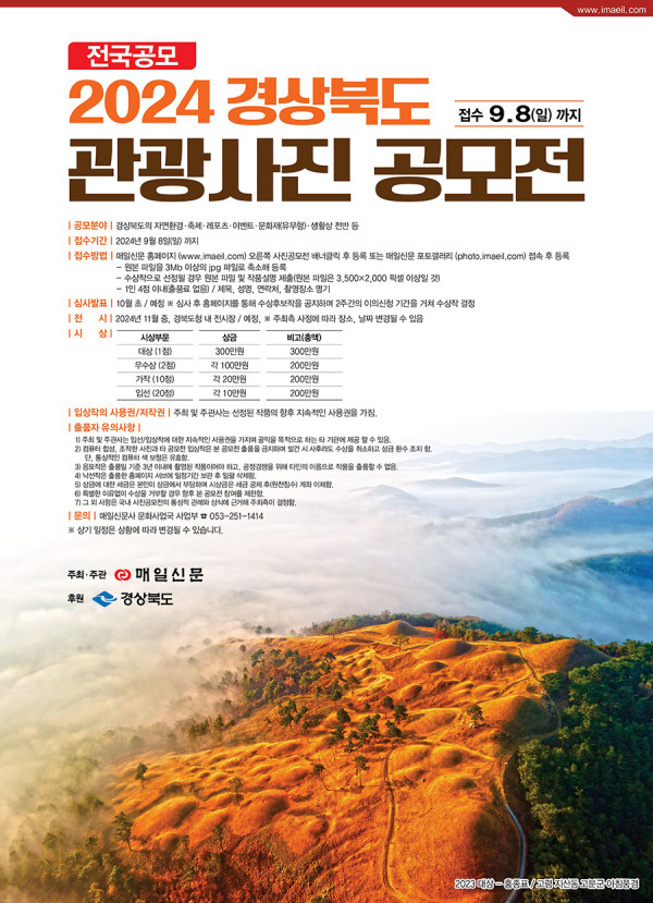 ■ 공모내용 경상북도의 자연환경과 축제, 레포츠, 이벤트, 유·무형 문화재, 생활상 전반 등 ■ 참가자격 제한없음 ■ 출품수 1인 4점 이내(출품료 없음) / 제목, 성명, 연락처, 촬영장소 명기 ■ 참가방법 공모전 홈페이지를 통한 직접 접수 http://photo.imaeil.com/sub/sub02.htm?menu_cd=50&tab=2&class_cd=52 ■ 작품규격 - 원본 파일을 3Mb 이상의 jpg 파일로 축소해 등록 - 수상작으로 선정될 경우 원본 파일 및 작품 설명 제출 (원본 파일은 3,500x2,000 픽셀 이상일 것) ■ 시상내역 대상 1점 : 300만원 우수상 2점 : 각 100만원 가작 10점 : 각 20만원 입선 20점 : 각 10만원 ■ 결과발표 2024년 10월초 예정 ■ 유의사항 - 주최 및 주관사는 입선/입상작에 대한 지속적인 사용권을 가지며 공익을 목적으로 하는 타 기관에 제공 할 수 있음. - 컴퓨터 합성, 조작한 사진과 타 공모전 입상작은 본 공모전 출품을 금지하며 발견 시 사후라도 수상을 취소하고 상금 환수 조치 함. 단, 통상적인 컴퓨터 색 보정은 유효함. - 응모작은 출품일 기준 3년 이내에 촬영된 작품이어야 하고, 공정경 쟁을 위해 타인의 이름으로 작품을 출품할 수 없음. - 낙선작은 출품한 홈페이지 서버에 일정기간 보관 후 일괄 삭제함. - 상금에 대한 세금은 본인이 상금에서 부담하며 시상금은 세금 공제 후(원천징수) 계좌 이체함. - 특별한 이유없이 수상을 거부할 경우 향후 본 공모전 참여를 제한함. - 그 외 사항은 국내 사진공모전의 통상적 관례와 상식에 근거해 주 최측이 결정함. |