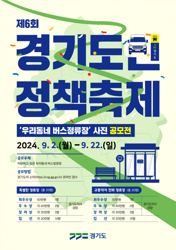 ■ 공모내용 자랑하고 싶은 우리동네 버스정류장 - 특별한 경기도 버스정류장 : 정류장의 구조, 특별한 컨셉이나 테마, 다양한 기능 등 특별한 정류장 - 교통약자 친화적인 경기도 버스정류장 : 구조 상 교통약자가 이용하기 편리한 정류장 ※ 지역 : 경기도 내 버스정류장(응모 시 해당 정류장의 정류장번호 제출) ※ 기간 : 공고일 기준 3개월 이내 촬영한 사진(수상후보작 촬영지 방문해 검증 예정) ■ 공모부문 - 특별한 경기도 버스정류장 - 교통약자 친화적인 경기도 버스정류장 ■ 참가자격 누구나 ■ 출품수 사진 1장, 작품설명(정류장 위치 포함) 및 개선방안 포함 200자 이내(띄어쓰기 포함) ■ 참가방법 공모전 홈페이지를 통한 온라인 접수 ■ 작품규격 - 최소 3,000×2,000픽셀 이상 - 핸드폰 사진 가능 - 스튜디오 사진 등 전문사진기사가 촬영한 작품 응모 불가 - 파노라마 사진 응모 불가 - 컴퓨터 그래픽 및 합성사진, 보정어플 사용 및 보정사진 응모 불가 - 용량 10MB 이하 ■ 시상내역 최우수상 2점(부문별 각1점) : 각 50만원 우수상 4점(부문별 각2점) : 각 40만원 장려상 6점(부문별 각3점) : 각 30만원 입선 28점(부문별 각14점) : 각 20만원 ■ 결과발표 10월 중 ■ 유의사항 ○ 개인(단체 접수 불가)으로만 응모할 수 있으며, 응모자 1인이 1점만 응모할 수 있음. ○ 온라인 작품 접수 마감일에 과부하로 인한 전산상 오류 등을 감안하여 사전에 접수하도록 하며, 이에 따른 책임은 응모자에게 있음. ○ 응모자 본인이 저작권을 보유한 직접 제작물만 출품 가능하며, 다른 공모전 수상 경력이 없는 작품이어야 함. ○ 규격 미준수, 신청서 누락 및 허위 오기재의 경우 심사 대상에서 제외됨. ○ 작품의 촬영 장소는 일반인 출입 및 촬영이 가능한 장소이고 초상권, 저작권, 명예훼손 등 법적 분쟁의 소지가 없어야 함. ○ 입상 작품이 제3자의 저작권을 침해한 것으로 확인된 경우 입상자는 입상 무효와 함께 관련된 모든 법적인 책임을 짐. 이외 사유로 분쟁이 발생한 경우 양 당사자는 원만한 분쟁 해결을 위해 상호 노력하여야 하며 해결되지 않을 시 한국저작권위원회의 조정 결과에 따름. ○ 입상작 발표 후 조작, 표절 및 저작권 문제가 발생한 경우에는 입상 무효 조치함. ○ 심사를 통해 수상작이 없다고 판단 될 경우, 수상작을 선정하지 않을 수 있으며 응모 작품의 수준에 따라 수상 인원이 조정될 수 있음. ○ 공모일정, 발표 및 시상 시기는 내부사정에 따라 변경될 수 있으며 세부 심사결과는 공개하지 않음. ○ 응모작 수, 심사 결과에 따라 시상 작품 수가 조정되거나 수상작이 없을 수 있음. ○ 수상자의 잘못된 정보 입력으로 인한 연락 누락, 부재 등의 경우 수상 결정 후에도 수상이 취소될 수 있음. ○ 공모전 수상작(최우수상/우수상/장려상/입선)은 이후 오프라인 전시회, 각종 온․오프라인 매체 홍보 및 공익적 목적으로 활용될 수 있음. ○ 공모전에 출품된 작품에 대한 저작권(저작재산권, 저작인격권)은 응모자에게 있으며, 수상 후에도 수상자에게 귀속됨을 원칙으로 함. ○ 주최자는 비영리·공익적 목적으로 입상작을 복제, 전송, 배포할 수 있고, 입상자와 별도의 합의를 통한 이용허락을 얻어 2차적 저작물을 작성할 수 있음. ○ 제출한 서류 및 출품작은 반환하지 않고 최종 발표일로부터 3개월 이내 폐기함. ○ 그 밖의 정하지 않은 사항은 주최 측의 결정에 따름. ○ 출품자(미성년자의 경우 대리인 포함)는 참가신청서, 개인정보 수집 및 공모전 수상작 이용 동의서를 제출해야 함. ○ 참가신청서를 제출한 응모자는 위의 모든 내용에 동의한 것으로 간주함. |