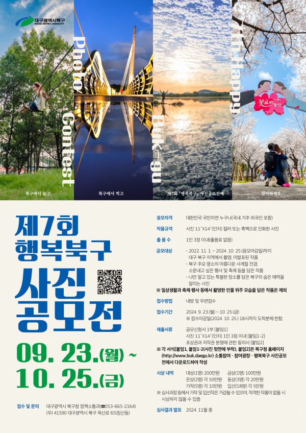 ■ 공모내용 2022년 11월 1일부터 2024년 10월 25일(응모마감일)까지 대구 북구 지역에서 촬영하고, 미발표된 작품으로 - 북구 주요 명소의 아름다운 사계절 전경, 소문내고 싶은 행사 및 축제 등을 담은 작품 - 나만 알고 있는 특별한 장소를 담은 북구의 숨은 매력을 알리는 사진 ※ 단, 일상생활과 축제·행사 등에서 촬영한 인물위주 모습을 담은 작품은 제외 ■ 참가자격 대한민국 국민 누구나(국내거주 외국인 포함) ■ 출품수 1인 3점 이내 (출품료 없음) ※ 1인이 다수의 작품을 제출하였을 때 동일인에 대한 중복시상이 가능함. ■ 참가방법 - 내방 및 우편접수 : 대구광역시 북구청 정책소통과(홍보소통팀 ☎053-665-2164), [우41590 대구광역시 북구 옥산로 65(침산동)] - 제출서류 : 사진공모신청서, 사진11〞× 14〞(인치) 1인 3점 이내, 초상권과 저작권 분쟁에 관한 동의서 ■ 작품규격 사진11“×14“ ■ 시상내역 대상(1점) : 대구광역시북구청장 상장 및 상금 200만원 금상(1점) : 대구광역시북구청장 상장 및 상금 100만원 은상(2점) : 대구광역시북구청장 상장 및 상금 각 50만원 동상(3점) : 대구광역시북구청장 상장 및 상금 각 20만원 가작(5점) : 대구광역시북구청장 상장 및 상금 각 10만원 입선(18점) : 대구광역시북구청장 상장 및 상금 각 5만원 ■ 결과발표 2024. 11월 중 - 북구청 홈페이지에 공고하고, 입상자는 개별 통보함. |