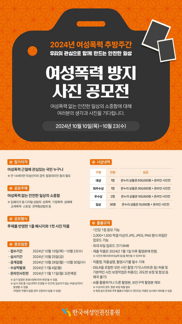 ■ 공모내용 여성폭력 없는 안전한 일상의 소중함 ※ 딥페이크 등 디지털 성범죄·성폭력·가정폭력·성매매 교제폭력·스토킹·권력형성범죄 등 ■ 참가자격 여성폭력 근절에 관심있는 국민 누구나 ■ 출품수 주제를 반영한 1줄 메시지와 1컷 사진 작품 1인당 1점 응모 가능 ■ 참가방법 공모전 홈페이지를 통한 직접 접수 ■ 작품규격 - 2,000×1,500 픽셀 이상의 JPG, JPEG, PNG 형식 파일만 업로드 가능 - 최대 파일 업로드 크기 6MB - 제출 작품은 2024년 1월 1일 이후 촬영본에 한함. ※ 사진의 메타데이터(날짜등을) 확인할수 있어야 함. - 작품명, 작품설명, 촬영시기를 필수기재 - DSLR을 포함한 모든 사진 촬영기기(스마트폰 등) 허용 및 기본적인 사진 보정작업은 허용(단, 과도한 보정 및 합성 등 왜곡 불가) - AI를 활용하거나 드론촬영본, 보안구역 촬영본 제외 ※ 수상자의 경우 원본파일 제출 필요 ※ 화질 등의 문제로 추후 활용이 어렵다고 판단되는 작품은 심사에서 제외될 수 있음 ■ 시상내역 대상 1점 : 온누리상품권 50만원 + 온라인 사진전 최우수상 1점 : 온누리상품권 30만원 + 온라인 사진전 우수상 2점 : 각 온누리상품권 10만원 + 온라인 사진전 입상 36점 : 각 온누리상품권 1만원 + 온라인 사진전 ■ 결과발표 2024년 11월 4일(월) |