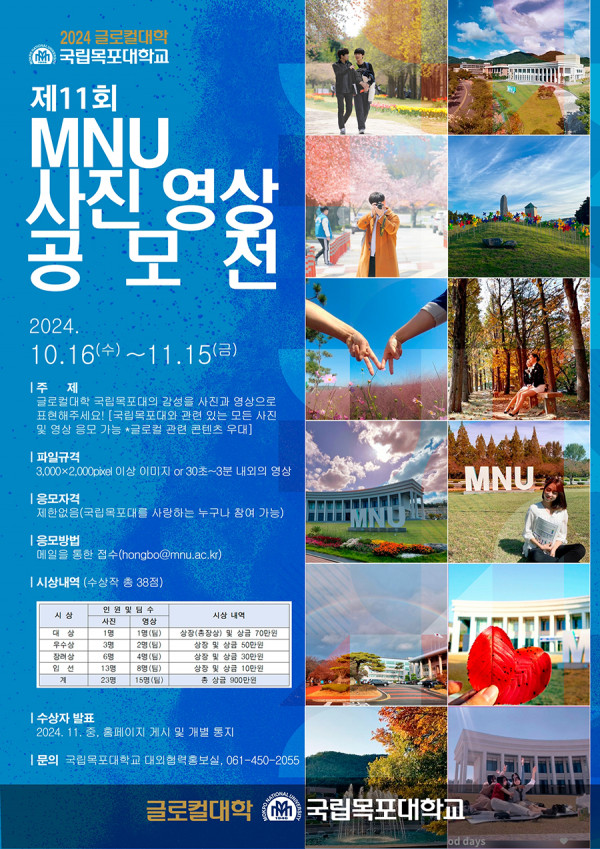 ■ 공모내용 글로컬대학 국립목포대의 감성을 사진과 영상으로 표현해 주세요! [국립목포대와 관련 있는 모든 사진 및 영상 응모 가능 *글로컬 콘텐츠 우대] ■ 참가자격 제한없음(국립목포대를 사랑하는 누구나 참여 가능) ■ 출품수 1인당 3작품 이내 ■ 참가방법 참가신청서, 설문지와 함께 메일을 통한 접수( hongbo@mnu.ac.kr ) ■ 작품규격 긴쪽의 사이즈가 3,000픽셀 이상의 JPG형식 ■ 시상내역 대상 1점 : 70만원 우수상 3점 : 각 50만원 장려상 6점 : 각 30만원 입선 13점 : 각 10만원 ■ 결과발표 11월 중[예정] 개별 통지, 홈페이지 게시 |