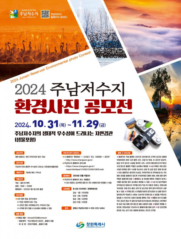 ■ 공모내용 주남저수지의 생태적 우수성이 드러나는 자연경관(생물포함) ■ 참가자격 제한 없음(단, 개인 자격으로만 응모 가능) ■ 출품수 1인당 2점까지 접수 가능 ■ 참가방법 이메일 제출 : kkcss0103@korea.kr - 메일제목 : 주남 환경사진 공모전_출품자 이름 - 파 일 명 : (번호)작품명_출품자 이름 제출사항 : 사진 원본 파일, 참가신청서 ■ 작품규격 - 색상 : 컬러 및 흑백 - 해상도 : 긴 변이 3,000픽셀 이상 - 용량 : 5MB ∼ 50MB - 파일형식 : JPG, PNG (*메타정보 필수) - 촬영일자 : 2023년 1월 1일 이후 촬영 ■ 시상내역 금상 1점 : 100만원 은상 2점 : 각 50만원 동상 3점 : 각 30만원 입선 21점 : 각 10만원 ■ 결과발표 2024년 12월 11일(수) ■ 유의사항 - 출품작은 직접 촬영한 사진으로 응모형식과 규격이 공고된 내용에 부합하여야 하며 드론 촬영 사진, 표절 및 복제, 타 공모전 입상작, 합성·조작 등으로 사실을 왜곡한 사진, 사진의 메타정보(EXIF정보) 수정 등으로 출품한 작품은 심사에서 제외됨 - 수상 후에도 위와 같은 사실이 밝혀질 경우 수상을 취소하고 상장 및 상금 등은 일체 회수함 - 모든 출품작은 제3자의 초상권, 저작인격권 및 저작재산권 등 기타 제반 권리를 침해하지 않도록 주의의무를 다해야 하며, 이에 대한 법적 책임은 출품자에 있음 - 촬영장소 등 정보를 정확히 기재하지 않거나 식별이 불가할 경우 심사에서 제외될 수 있음 - 수상 및 입선작품의 저작재산권 일체(2차 저작물 등의 작성 및 이용권 포함)는 창원시에 귀속되며, 인쇄·전시·홍보·교육 및 보도자료 제작 등의 목적으로 사용될 수 있음 - 2작품 응모 시 파일명 번호와 참가신청서 상 설명 번호가 일치하도록 작성하고 사정상 시상식이 미개최 될 시 상장을 우편으로 발송할 수 있으므로 신청서 정보를 정확히 기재 - 제출된 문서 및 출품작은 공모전 종료 후 일체 파기되며 참가신청서의 개인정보는 본인확인 및 상금 지급 외에 다른 용도로 일절 사용하지 않음 - 일정은 변경될 수 있으며, 변경사항은 주남저수지 홈페이지를 통해 공지 - 본 공모전에 응모한 자는 상기 모든 내용에 동의하는 것으로 간주함. |