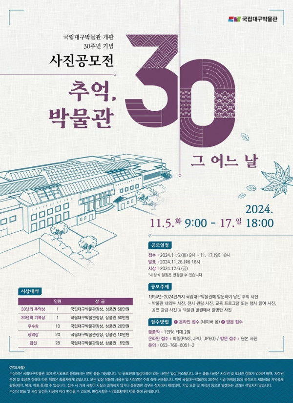■ 공모내용 1994년~2024년 중 국립대구박물관을 방문하여 남긴 추억의 사진 o 국립대구박물관의 특별전, 상설전시, 교육, 문화행사 등 가족, 친구, 지인등 다양한 사람들과의 추억, 기록이 있는 사진 o 국립대구박물관 휴(休)룸에서 전시하여, 함께 한 30년의 추억과 기록 공유 ■ 참가자격 별도 제한없음 ■ 출품수 1인 2장 이내 ■ 참가방법 온라인 접수 : https://naver.me/5apKemPV 방문접수 ■ 작품규격 PNG, JPG, JPEG ■ 시상내역 30년의 추억상 1점 : 상품권 50만원 30년의 기록상 1점 : 상품권 50만원 우수상 10점 : 각 상품권 20만원 장려상 20점 : 각 상품권 10만원 입선 28점 : 각 상품권 5만원 ■ 결과발표 2024.11.26(화) 16시 ■ 유의사항 ㅇ 수상작은 국립대구박물관 내에 전시되므로 동의하시는 분만 출품가능합니다. ㅇ 타 공모전의 입상이력이 있는 사진은 입상 취소됩니다 ㅇ 모든 출품사진은 초상권 및 저작권 침해가 없어야 하며, 저작권 분쟁 및 초상권 침해에 따른 책임은 출품자에게 있습니다. ㅇ 모든 입상 작품의 사용권 및 저작권은 주최 측에 귀속됩니다. 이에 국립대구박물관의 30주년 기념 마케팅 등의 목적으로 제출작을 자유롭게 활용(제작, 복제, 배포 등)을 할 수 있습니다. ㅇ 접수 시 기재 사항이 사실과 일치하지 않거나 불분명한 경우는 심사에서 제외되며, 기입 오류 및 미작성 등으로 발생하는 결과는 책임지지 않습니다. ㅇ 수상작 발표 및 시상 일정은 사정에 따라 변경될 수 있으며, 변경사항은 누리집을 통해 공지합니다. |