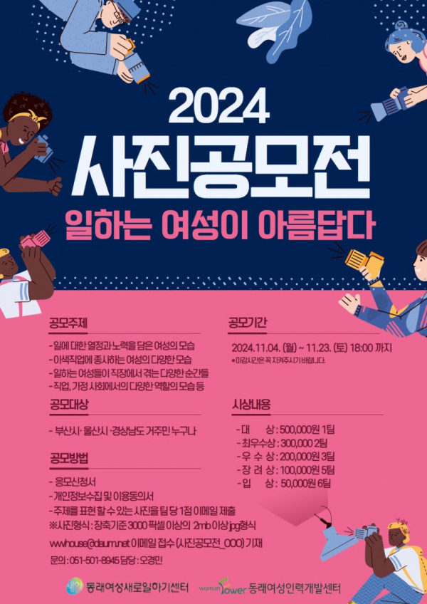 ■ 공모내용 일하는 여성이 아름답다 ※ 세부주제(예): 1. 일에 대한 열정과 노력을 담은 여성의 모습 2. 이색직업에 종사하는 여성의 다양한 모습 3. 일하는 여성들이 직장에서 겪는 다양한 순간들 4. 직업, 가정 사회에서의 다양한 역할의 모습 등 ■ 참가자격 부산시·울산시·경상남도 거주민 누구나 ■ 출품수 개인 또는 1팀으로 구성, 동일인 1작품으로 참여가능 (복수 작품 응모 불가) ■ 참가방법 - 담당자 이메일( wwhouse@daum.net ) - 파일 제목: 사진공모전_성명 또는 팀명 - 제출서류 : 응모신청서, 개인정보 수집 및 이용 동의서 ■ 작품규격 장축기준 3000 픽셀 이상의 2mb 이상 jpg 형식 1점 제출 ※ 저작권, 초상권 등의 법적문제가 없어야 함 ■ 시상내역 대상1팀_500,000원 / 최우수상 2팀_300,000원 / 우수상 3팀_각 200,000원 / 장려상 5팀_각 100,000원 / 입상 6팀_50,000원 ■ 결과발표 2024.12월 초 예정(센터 홈페이지 게재 및 개별통보) |