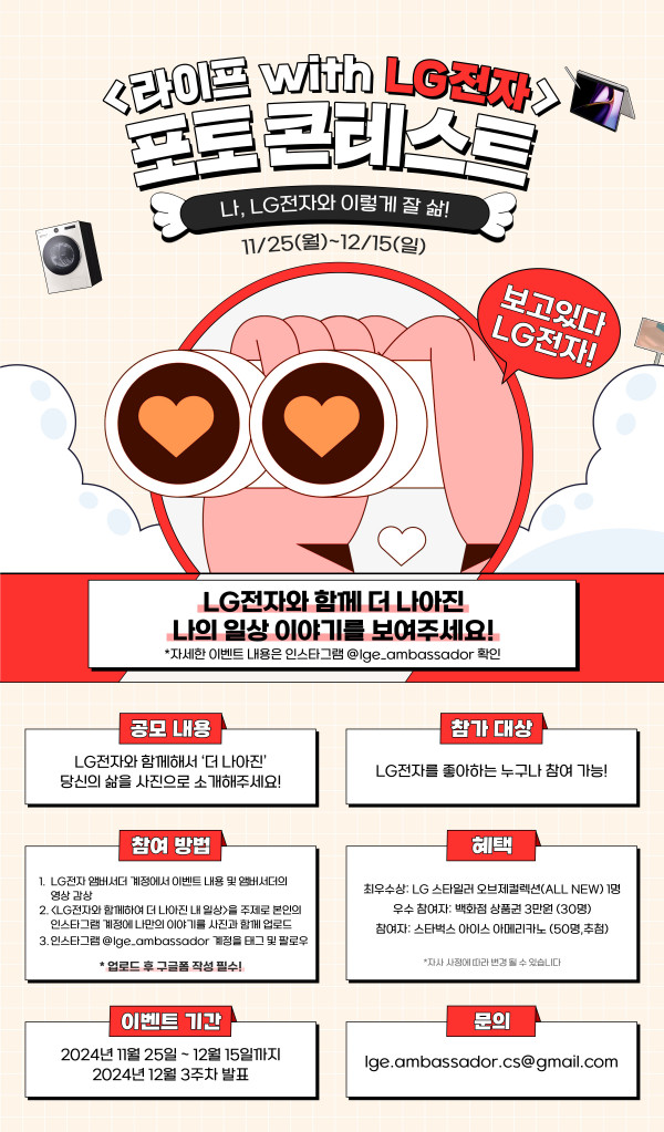 ■ 공모내용 나, LG전자와 이렇게 잘 삶! LG전자와 함께해서 ‘더 나아진 당신의 삶‘을 사진으로 소개해주세요! ■ 참가자격 LG전자를 좋아하고, LG전자 제품을 가지고 있는 누구나! ■ 출품수 중복 당첨(휴대폰 번호 기준)은 허용하지 않으며, 경품은 1인 1회 지급 ■ 참가방법 1. LG전자 앰버서더 계정에서 이벤트 내용 및 앰버서더의 영상 감상하기 2. <LG전자와 함께해서 더 나아진 내 일상>을 주제로 본인의 인스타그램 계정에 나만의 이야기를 사진과 함께 업로드 3. 인스타그램 @lge_ambassador 계정 태그 및 팔로우 4. 업로드한 SNS URL을 구글폼에 제출하면 끝! (구글폼 링크는 LG전자 앰버서더 계정 프로필 확인 또는 https://bit.ly/4fOjli2 ) #LG전자 #LG전자앰버서더 #더_나은_삶 #보고있나LG전자 #보고있다LG전자 #라이프withLG전자 #LG전자포토콘테스트 #나LG전자와이렇게잘삶 ■ 시상내역 - 최우수상: LG 스타일러 오브제컬렉션(ALL NEW), 1명 - 우수 참여자: 백화점 상품권 3만원, 30명 - 참여자: 스타벅스 아이스 아메리카노, 50명(추첨) ■ 결과발표 @lge_ambassador 계정을 통해 개별 DM 안내 ■ 유의사항 ※ 명의 도용 및 콘텐츠 도용 등 비정상적이고 불법적 방법으로 참여 시 당첨자 선정 취소될 수 있습니다. ※ 우수작의 경우 내부 선발 기준에 따라 선정되며, 선정 기준에 대한 별도의 답변은 제공하지 않습니다. ※ 지원 시 작성한 내용은 본 이벤트 운영과 관련된 업무에만 활용될 예정이며, 본 이벤트 관련 홍보, 운영, 관리 시 추가 동의 없이 활용될 수 있습니다. ※ 제출된 콘텐츠는 (주)LG전자의 마케팅 채널에 2차 가공되어 활용될 수 있으므로 원본 콘텐츠 납품 요청 드릴 수 있으며 대상자는 콘텐츠 납품의 의무가 있습니다. ※ 경품은 당사의 사정에 의해 사전 공지 없지 변경될 수 있으며, 당첨자 발표 일정과 발송 일정은 당사 사정에 의해 변경되거나 지연될 수 있습니다. ※ 이벤트는 사전 고지 없이 변경 될 수 있습니다. ※ 당첨자 발표 이후 한 달 동안 댓글을 삭제하거나 비공개 할 경우 당첨자 선정 과정에서 제외 또는 취소될 수 있습니다. ※ 당첨자 발표 일정은 당사 사정에 따라 미뤄질 수 있습니다. ※ 당첨자 발표는 @lge_ambassador 계정을 통해 개별 DM 안내됩니다. ※ 비공개 계정은 참여 확인이 불가하여 당첨자 선정에서 제외됩니다. ※ 타인의 명의 도용, 반복 참여 프로그램 이용 등 비정상적인 방법으로 참여 시 당첨이 제한될 수 있습니다. ※ 중복 당첨(휴대폰 번호 기준)은 허용하지 않으며, 경품은 1인 1회 지급합니다. ※ 잘못된 개인정보 입력으로 인해 당첨자에게 연락이 불가능하거나, 경품이 반송될 경우 재발송 되지 않으며 당사에서 책임지지 않습니다. ※ 수집된 개인정보는 당첨자 확인 및 경품 발송 용도로만 사용되며, 개인정보 정책에 따라 당첨자 발표 및 경품 발송 완료 후 폐기됩니다. ※ 이벤트 경품의 경우, 물량 및 제품의 수급 상황에 따라 변경 될 수 있으며, 이벤트 경품 배송일정은 당사 사정에 의해 변경되거나 지연될 수 있습니다. ※ 당첨자들에게는 경품 증정을 위해 개인 정보를 추가 수집할 수 있습니다. |