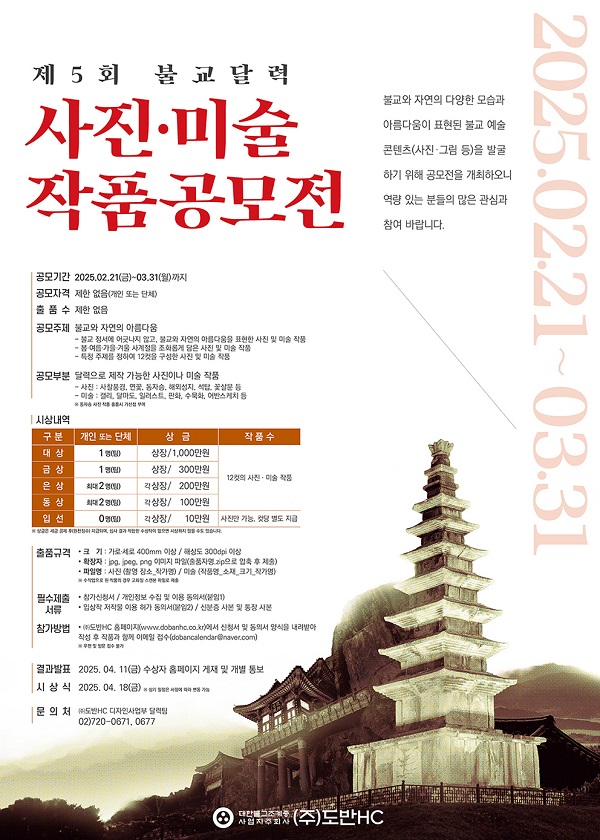 ■ 공모내용 불교와 자연의 아름다움 - 불교 정서에 어긋나지 않고, 불교와 자연의 아름다움을 표현한 사진 및 미술 작품 - 봄·여름·가을·겨울 사계절을 조화롭게 담은 사진 및 미술 작품 - 특정 주제를 정하여 12컷을 구성한 사진 및 미술 작품 ■ 참가자격 제한 없음(개인 또는 단체/만 18세 미만 미성년자는 법정대리인 동의서 필수) ■ 출품수 제한 없음 ■ 참가방법 ㈜도반HC 홈페이지( www.dobanhc.co.kr )에서 신청서 및 동의서 양식을 내려받아 작성 후 작품과 함께 이메일 접수( dobancalendar@naver.com ) ※ 우편 및 방문 접수 불가 ■ 작품규격 - 크 기 : 가로·세로 400mm 이상 / 해상도 300dpi 이상 - 확장자 : jpg, jpeg, png 이미지 파일(출품자명.zip으로 압축 후 제출) - 파일명 : 사진 (촬영 장소_작가명) / 미술 (작품명_소재_크기_작가명) ※ 수작업 작품의 경우 고화질 스캔본 파일로 제출 ■ 시상내역 대상 1점 : 1.000만원 금상 1점 : 300만원 은상 최대 2점 : 각 200만원 동상 최대 2점 : 각 100만원 입선 0점 : 각 10만원 (컷당 별도 지급) ■ 결과발표 2025. 04. 11(금) ※ 수상자 홈페이지 게재 및 개별 통보 |