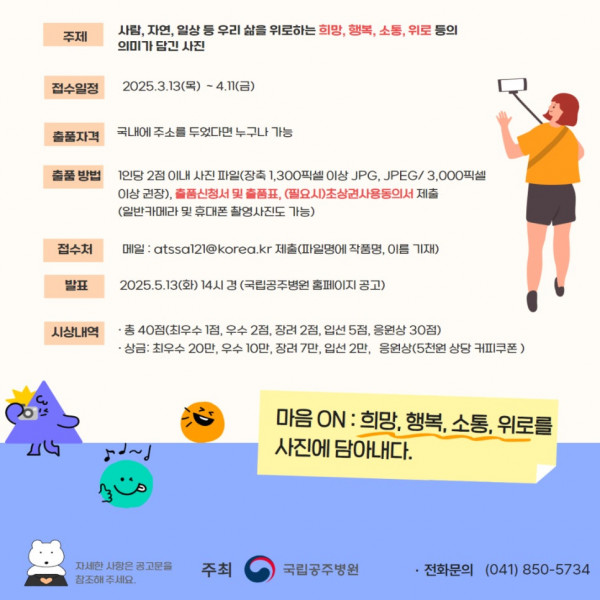 ■ 공모내용 사람ㆍ자연ㆍ일상 등 우리 삶을 위로하는 희망, 행복, 소통, 위로 등의 의미가 담긴 사진 ■ 참가자격 국내에 주소를 둔 자 누구나 ■ 출품수 출품자 본인이 직접 촬영한 작품으로 1인 2점 이내(수상은 1인 1작품에 한함) * 혼선 방지를 위하여 출품 신청서는 1인 1부에 한하여 제출 가능(2점 개별 신청 불가) ■ 참가방법 출품신청서 및 출품표(필수), 초상권 사용동의서(해당하는 경우)를 e-mail( atssa121@korea.kr )로 제출 * 파일명에 이름, 작품명 기재 ex)홍길동_작품명 ■ 작품규격 장축 1,300픽셀 이상 JPG, JPEG(메타정보 제공, 3,000픽셀 이상 권장) * 휴대폰 촬영 작품 가능 ■ 시상내역 최우수 1점 : 20만원 우수 2점 : 각 10만원 장려 2점 : 각 7만원 입선 5점 : 각 2만원 응원상 30점 : 커피쿠폰 각 5천원 ■ 결과발표 2025년 5월 13일(화) 14시 예정(국립공주병원 홈페이지 공고) |
