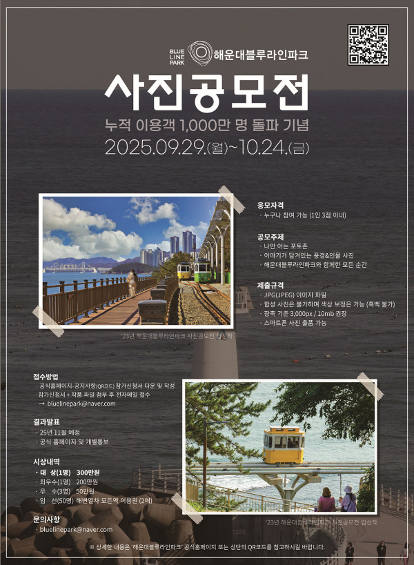■ 공모내용 나만 아는 포토존 이야기가 담겨있는 풍경&인물 사진 해운대블루라인파크와 함께한 모든 순간 ■ 참가자격 누구나 참여 가능 ■ 출품수 1인 3점이내(중복수상 불가) ■ 참가방법 이메일 접수 : bluelinepark@naver.com - 메일제목 [사진공모전 참가 참가자 상황] - 사진 파일명 [참가자 성함_작품명] - 제출서류 : 참가신청서 ■ 작품규격 JPG(JPEG) 이미지 파일 합성 사진은 불가하며 색상 보정은 가능 (흑백 불가) 장축 기준 3,000px/10mb 권장 스마트폰 사진 출품 가능 ■ 시상내역 대상 1점 : 300만원 최우수 1점 : 200만원 우수 3점 : 50만원 입선 50점 : 해변열차 모든역 이용권 2매 ■ 결과발표 2025년 11월 예정 |