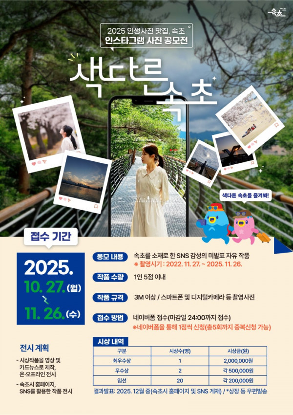 ■ 공모내용 속초를 소재로 한 SNS 감성의 미발표 자유 작품 *촬영시기 : 2022. 11. 27. ~ 2025. 11. 26. ■ 참가자격 속초를 사랑하는 대한민국 국민 누구나 (등록 외국인 포함) ■ 출품수 1인 5점 이내 (1점씩 개별 접수) ■ 참가방법 네이버폼을 통한 접수 : https://form.naver.com/response/H_9QftJcajcXbC0XllntVQ ■ 작품규격 3M 이상/스마트폰 및 디지털카메라 등 촬영사진 ■ 시상내역 최우수상 1점 : 200만원 우수상 2점 : 각 50만원 입선 20점 : 각 20만원 ■ 결과발표 2025 12월 중 |