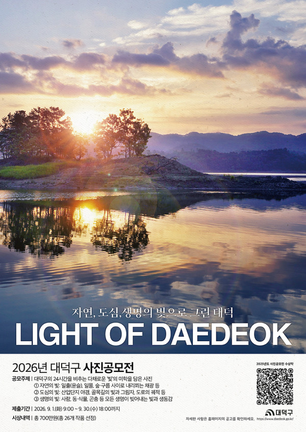 ■ 공모내용 대덕구의 24시간을 비추는 다채로운 ‘빛’의 미학을 담은 사진 1) 자연의 빛: 일출(윤슬), 일몰, 숲·구름 사이로 내리쬐는 채광 등 2) 도심의 빛: 산업단지 야경, 골목길의 빛과 그림자, 도로의 궤적 등 3) 생명의 빛: 사람, 동·식물, 곤충 등 모든 생명이 빚어내는 빛과 생동감 ■ 공모부문 일반, 드론 ■ 참가자격 전 국민 누구나 (지역/연령 무관, 팀 접수 불가) ■ 출품수 1인 각 3점 이내(부문 중복참여 가능) ■ 참가방법 이메일 제출 / daedeokpress@korea.kr 1) 제목: [2026년 대덕구 사진 공모전_(일반/드론)_본인 이름] ※ 예시: [2026년 대덕구 사진 공모전_일반_홍길동] 2) 파일명: 촬영일자_촬영장소_행사명_본인 이름_작품번호 ※ 예시: 2026. 4. 5._대청공원_대덕물빛축제_홍길동_01 ■ 작품규격 - 긴 쪽의 길이가 3,000픽셀(px)이상, 용량 10MB이하의 사진 - 보정본 제출 시 참가신청서에 보정 내역 필히 기재 ※ 2026년 중 대덕구에서 촬영한 본인의 순수 창작물만 가능하며, 발표된 적 없는 작품이어야 함. 일반 부문 - DSLR, 스마트폰 등 사진 촬영이 가능한 모든 기기로 찍은 사진 - 사진 파일에 촬영 정보(날짜, 시간, 카메라 설정 등)가 담겨있어야 함 드론 부문 - 드론으로 촬영한 사진으로, 관련 법령(비행 및 촬영 승인 등)을 반드시 준수하여야 함. - 촬영 정보에 촬영 일시 및 위치(위도, 경도)가 포함되어야 함. - GPS 기능이 없는 기종은 촬영 장소를 증빙할 수 있는 별도의 자료 제출 필요 ■ 시상내역 일반 부문 최우수 1점 : 70만원 우수 1점 : 40만원 장려 3점 : 각 20만원 입선 8점 : 각 10만원 드론 부문 최우수 1점 : 100만원 우수 1점 : 70만원 장려 3점 : 각 40만원 입선 8점 : 각 20만원 ■ 결과발표 2026. 10월 중 (개별 통보 및 대덕구청 홈페이지 게재) |
