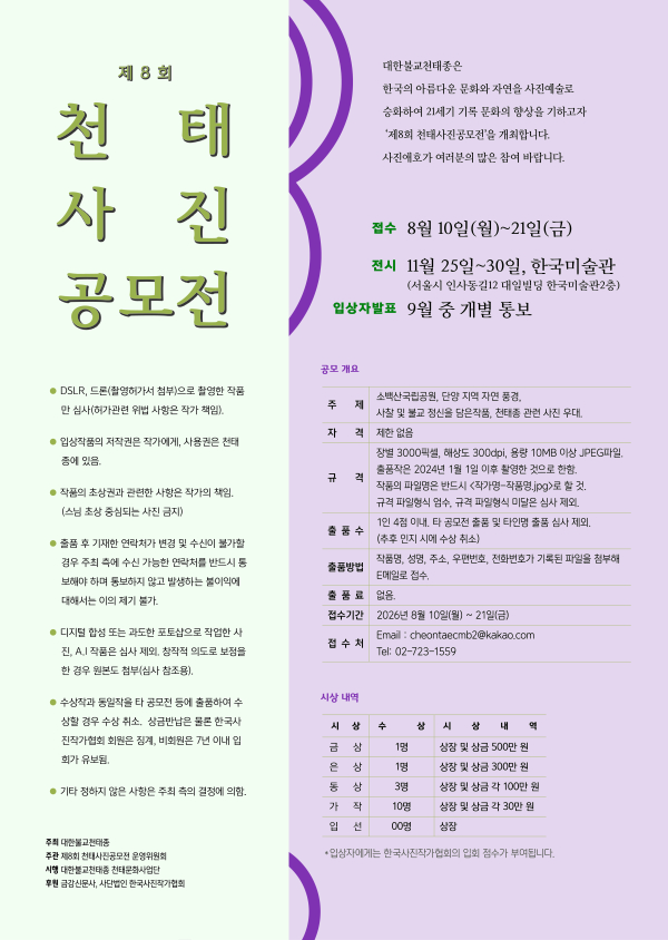 ■ 공모내용 소백산국립공원, 단양 지역 자연 풍경, 사찰 및 불교 정신을 담은 작품, 천태종 관련 사진 우대. ■ 참가자격 제한 없음 ■ 출품수 1인 4점 이내. 타 공모전 출품 및 타인명 출품 심사 제외. (추후 인지 시에 수상 취소) ■ 참가방법 이메일접수 : cheontaecmb2@kakao.com 작품명, 성명, 주소, 우편번호, 전화번호가 기록된 파일을 첨부해 E메일로 접수. ■ 작품규격 장변 3000픽셀, 해상도 300dpi, 용량 10MB 이상 JPEG파일. 출품작은 2024년 1월 1일 이후 촬영한 것으로 한함. 작품의 파일명은 반드시 <작가명-작품명.jpg>로 할 것. 규격 파일형식 엄수, 규격 파일형식 미달은 심사 제외. ■ 시상내역 금상 (1명): 상장 및 상급 500만 원 은상 (1명): 상장 및 상금 300만 원 동상 (3명): 상장 및 상금 각 100만 원 가작 (10명): 상장 및 상급 각 300만 원 입선 (00명): 상장 ■ 결과발표 9월중 |